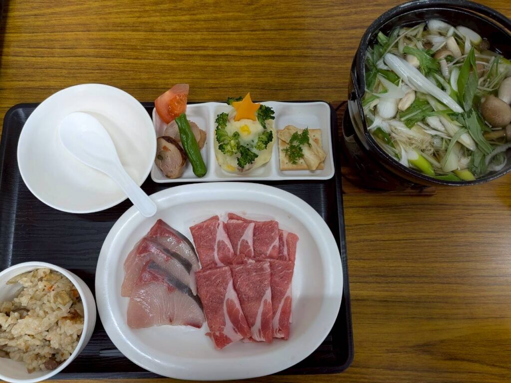 茶美豚葱しゃぶ&ブリしゃぶ鍋、前菜三種盛り、若鶏とゴボウの炊き込みご飯。