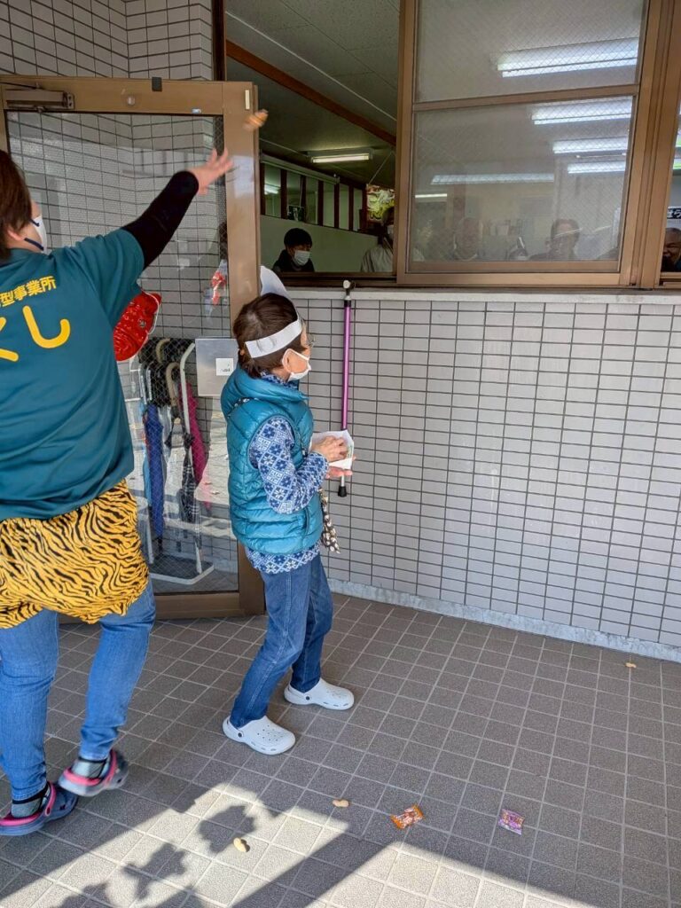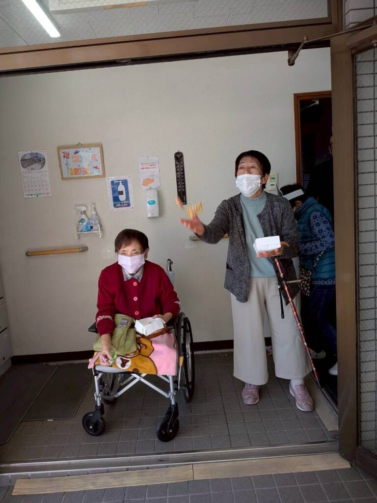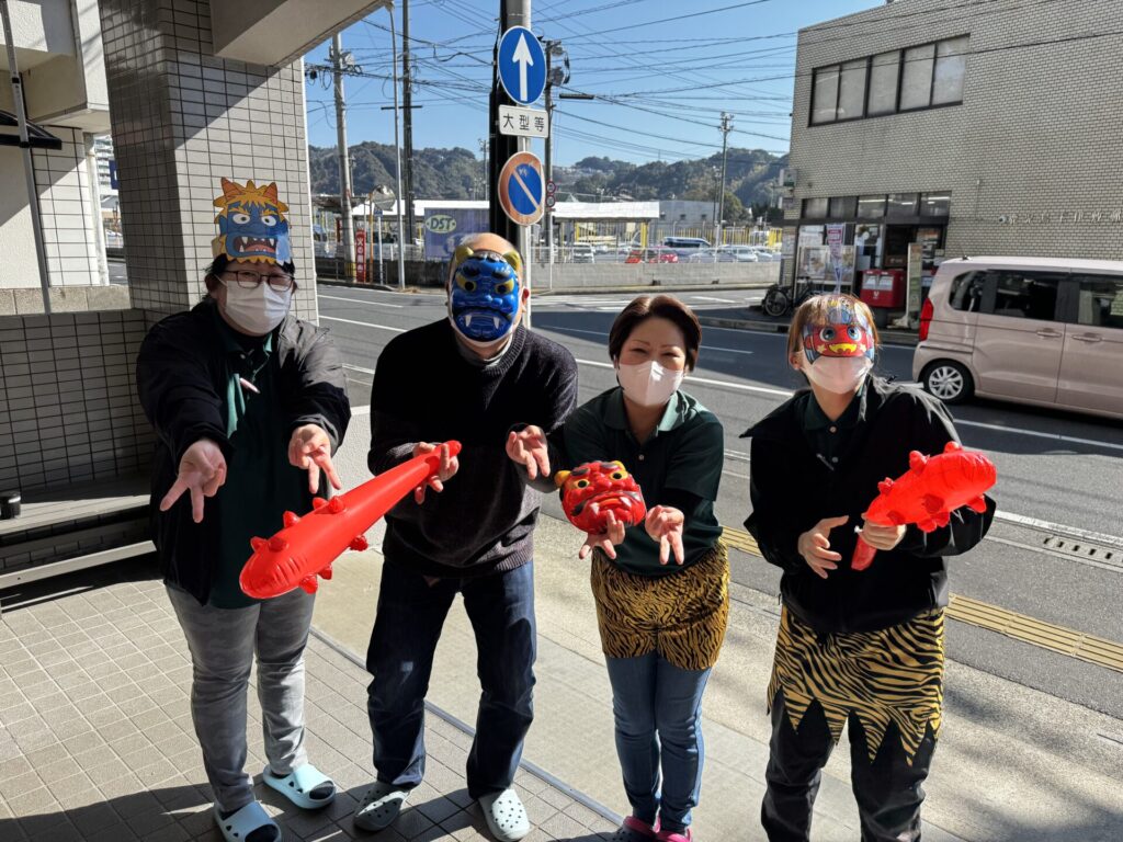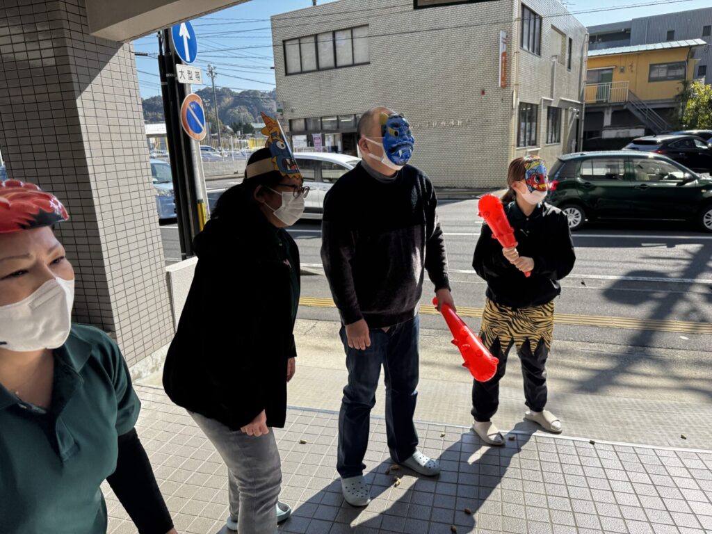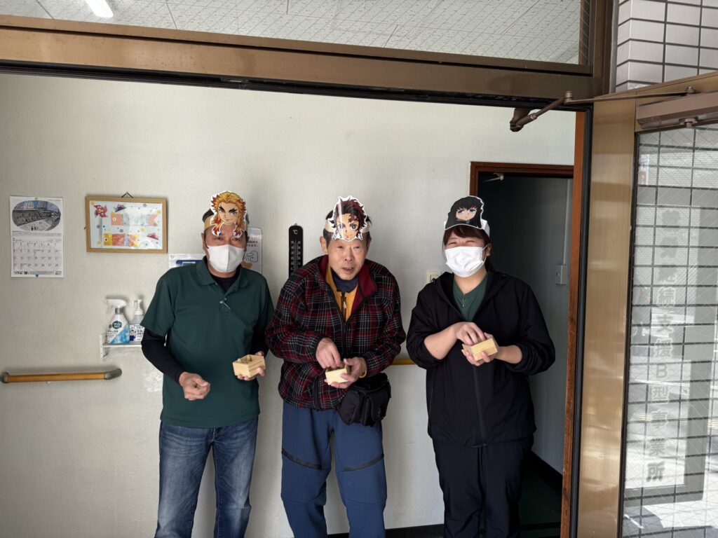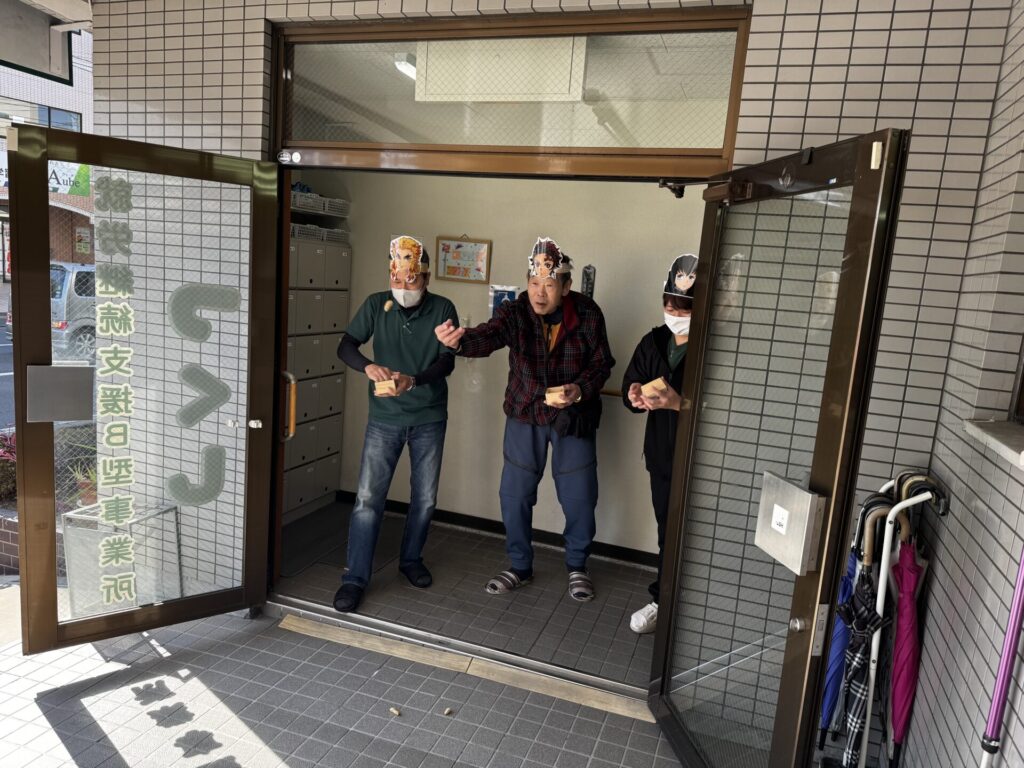 利用者さんや職員が鬼となり、「鬼は外~!福は内~!」と、思い思いに豆を投げて大盛り上がりでした✨
