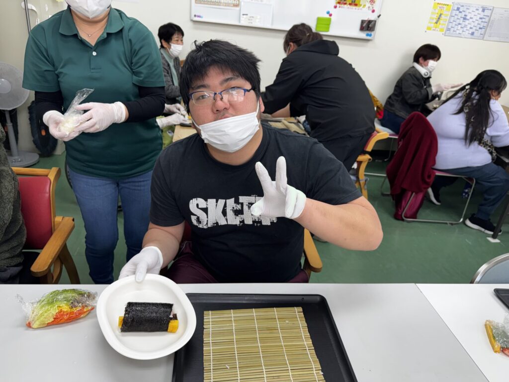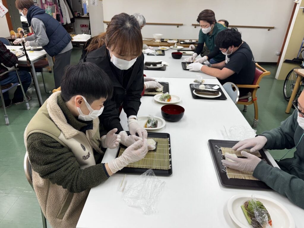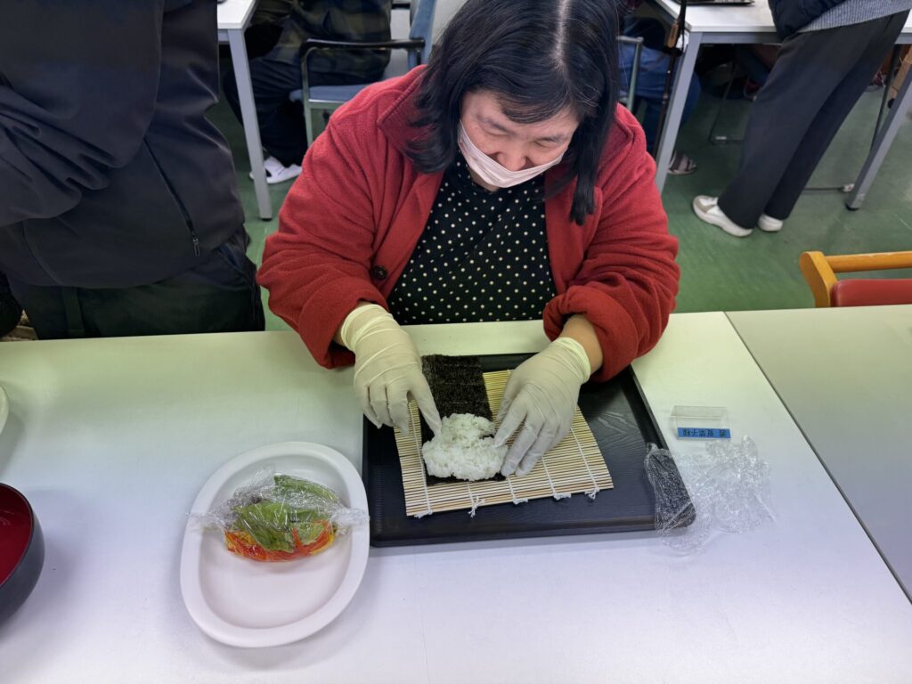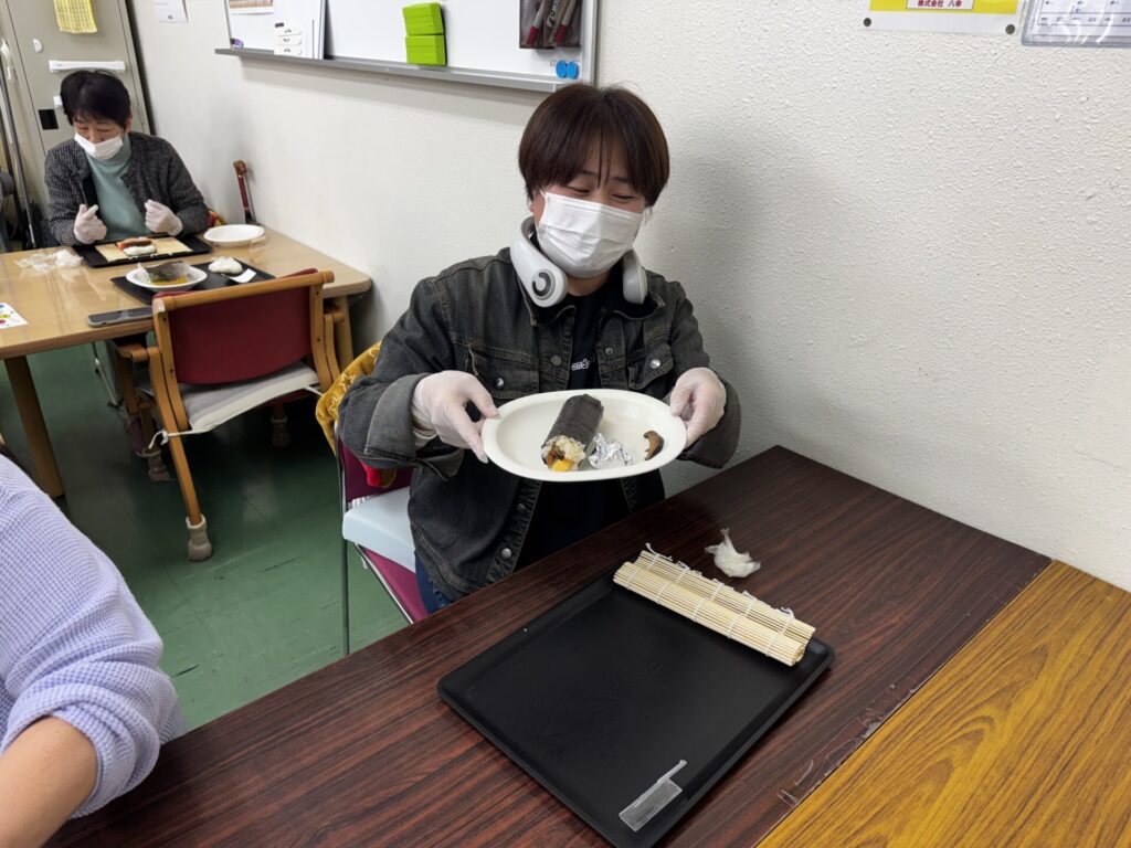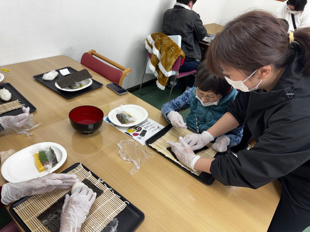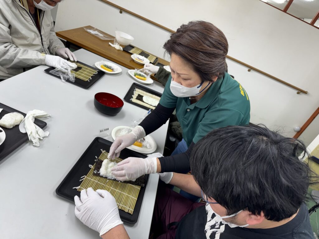 皆さんお好きな具材を選び、職員がお手伝いしながら、巻きすを使ってくるくる🎶