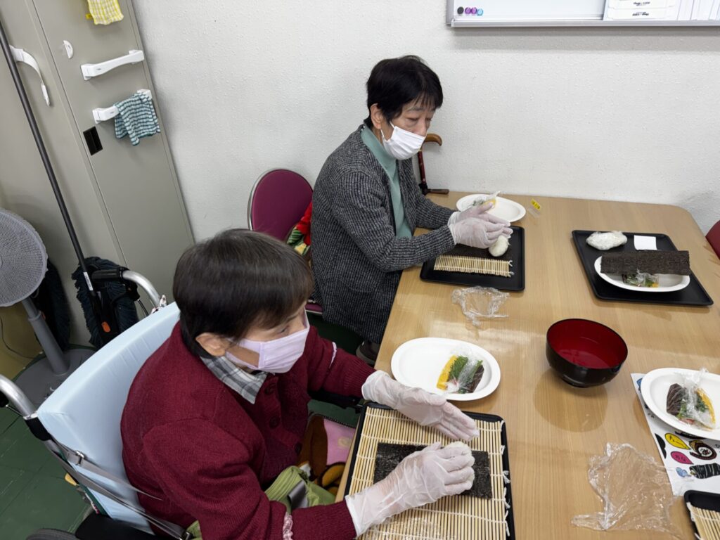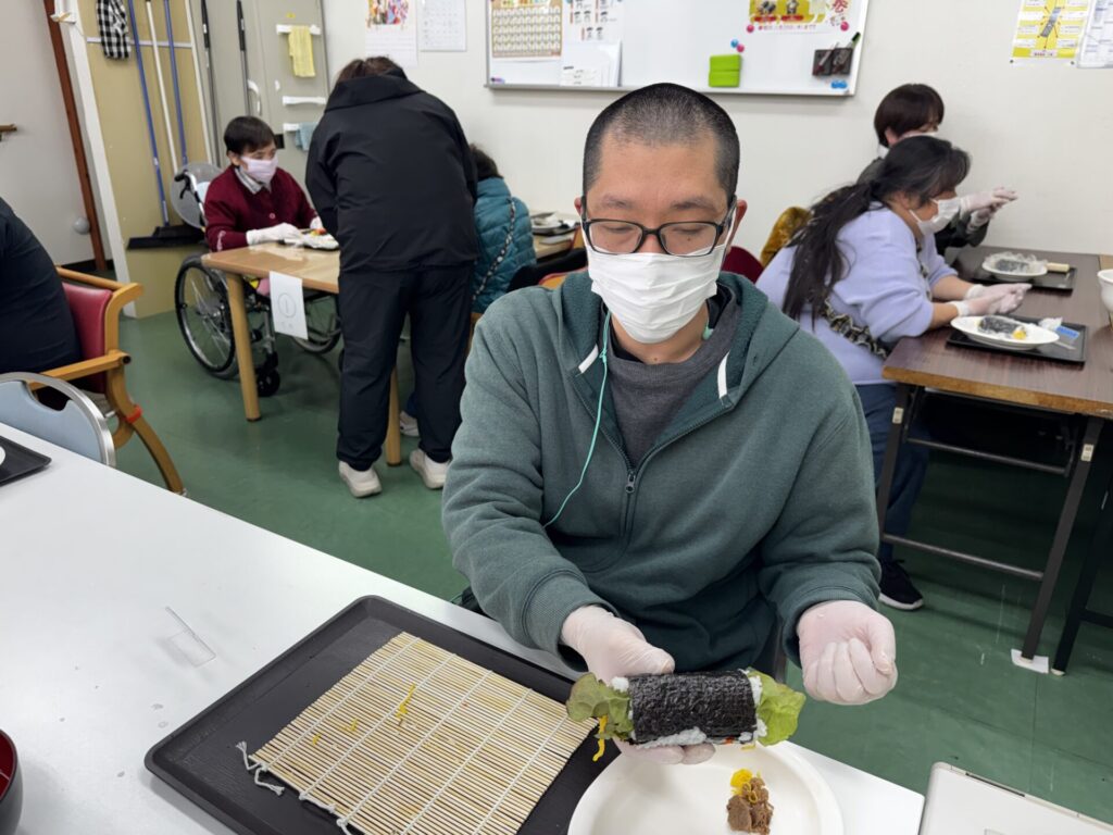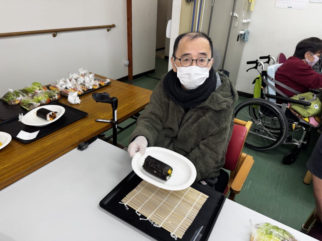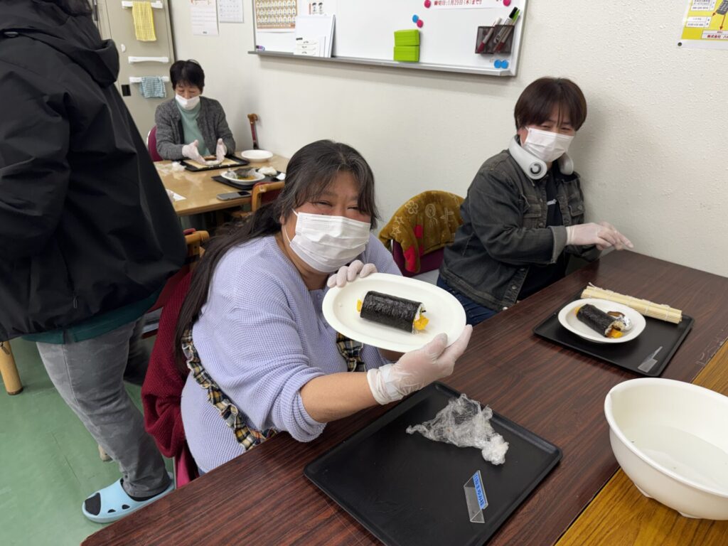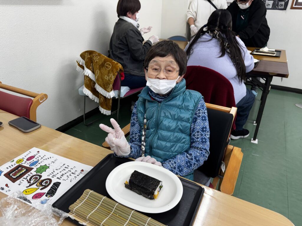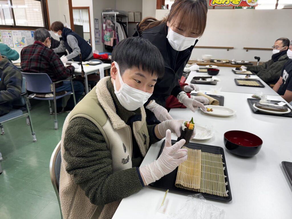 皆さんお好きな具材を選び、職員がお手伝いしながら、巻きすを使ってくるくる🎶