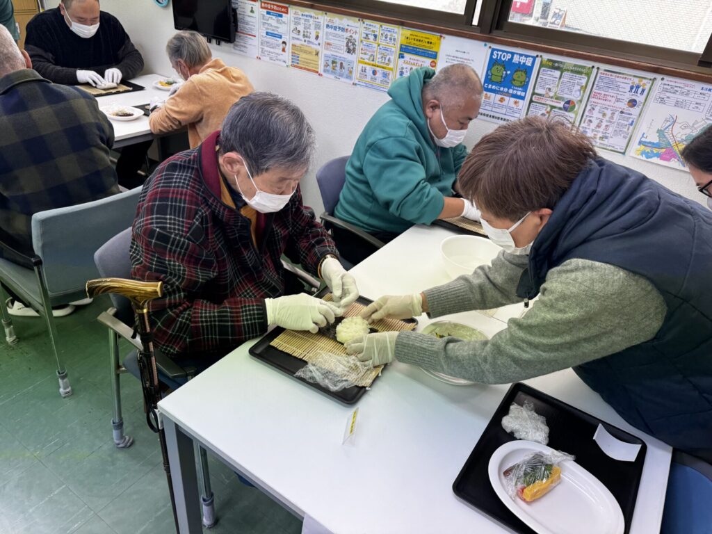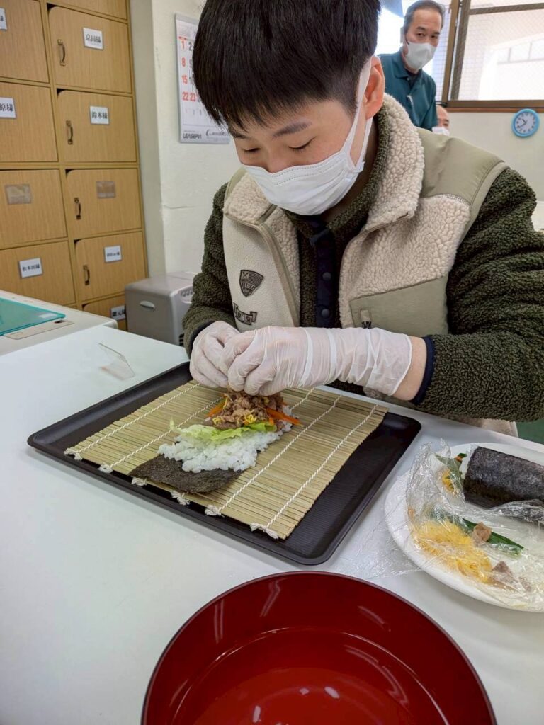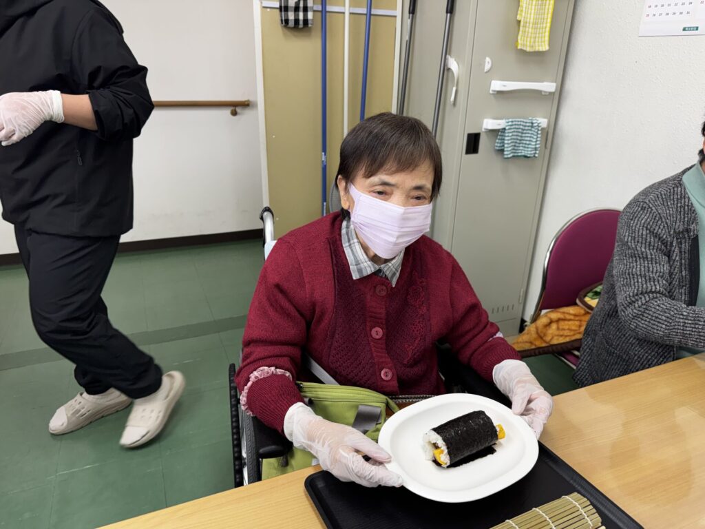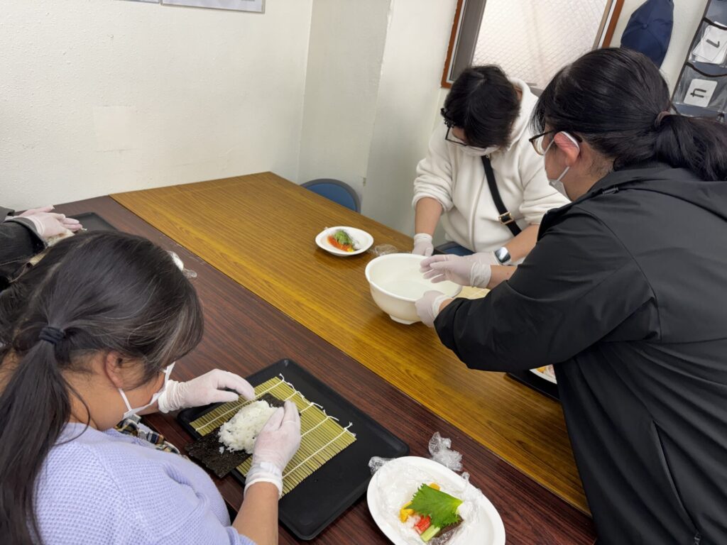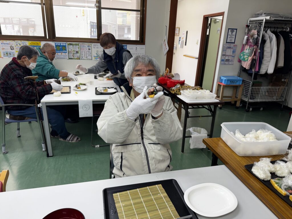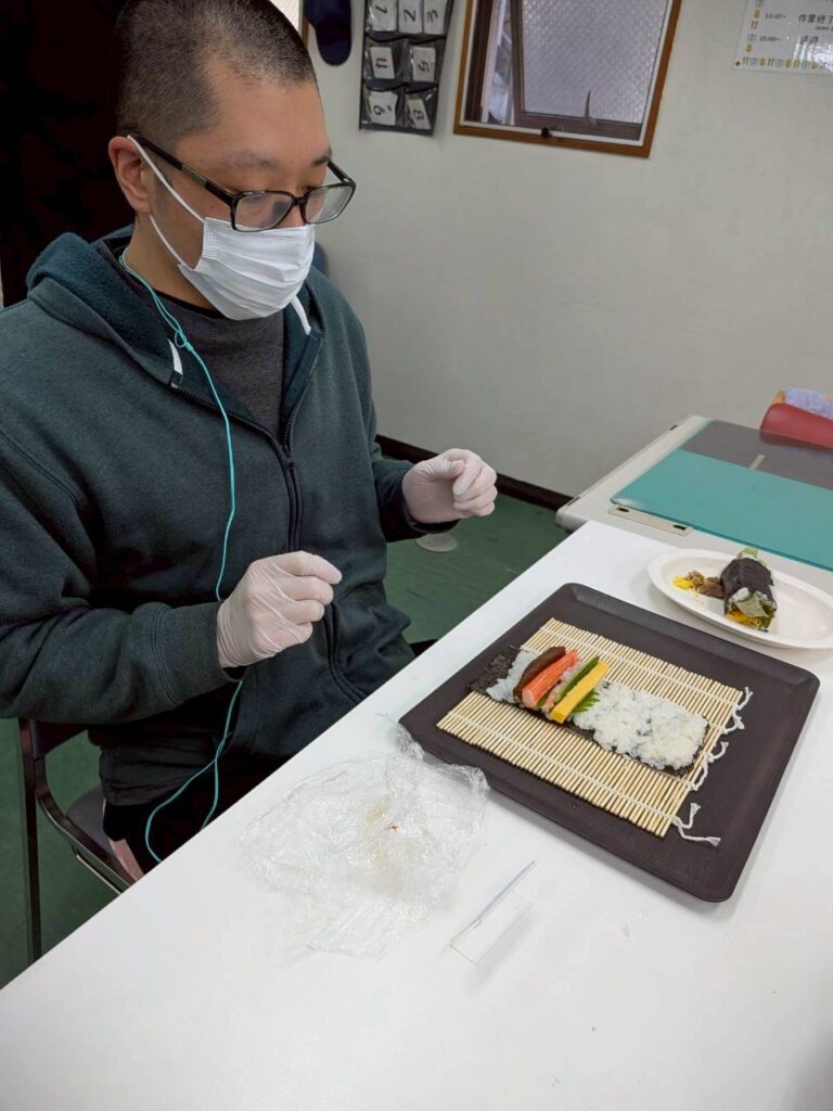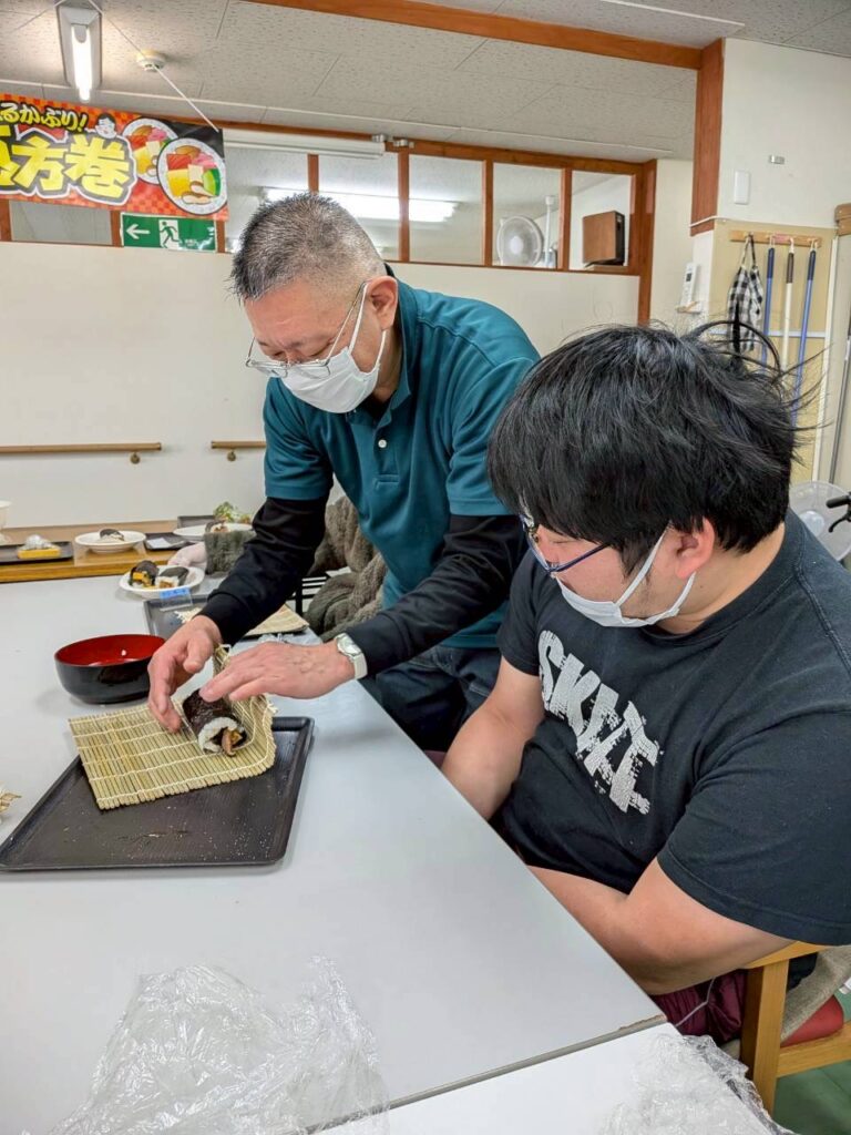 皆さんお好きな具材を選び、職員がお手伝いしながら、巻きすを使ってくるくる🎶