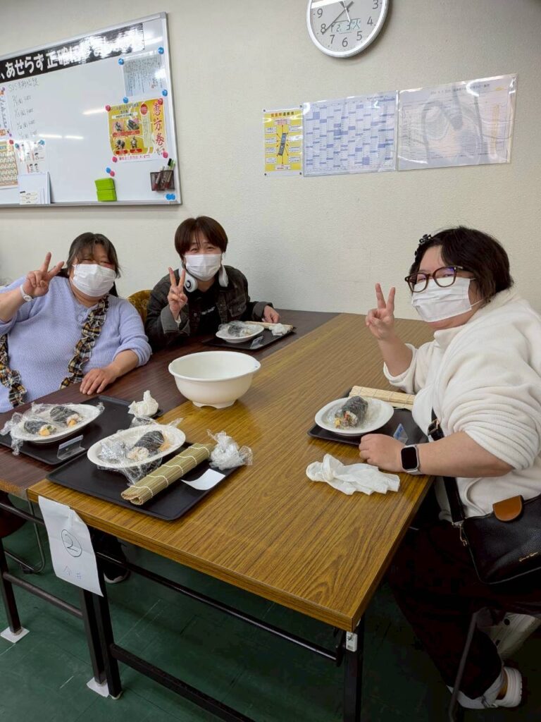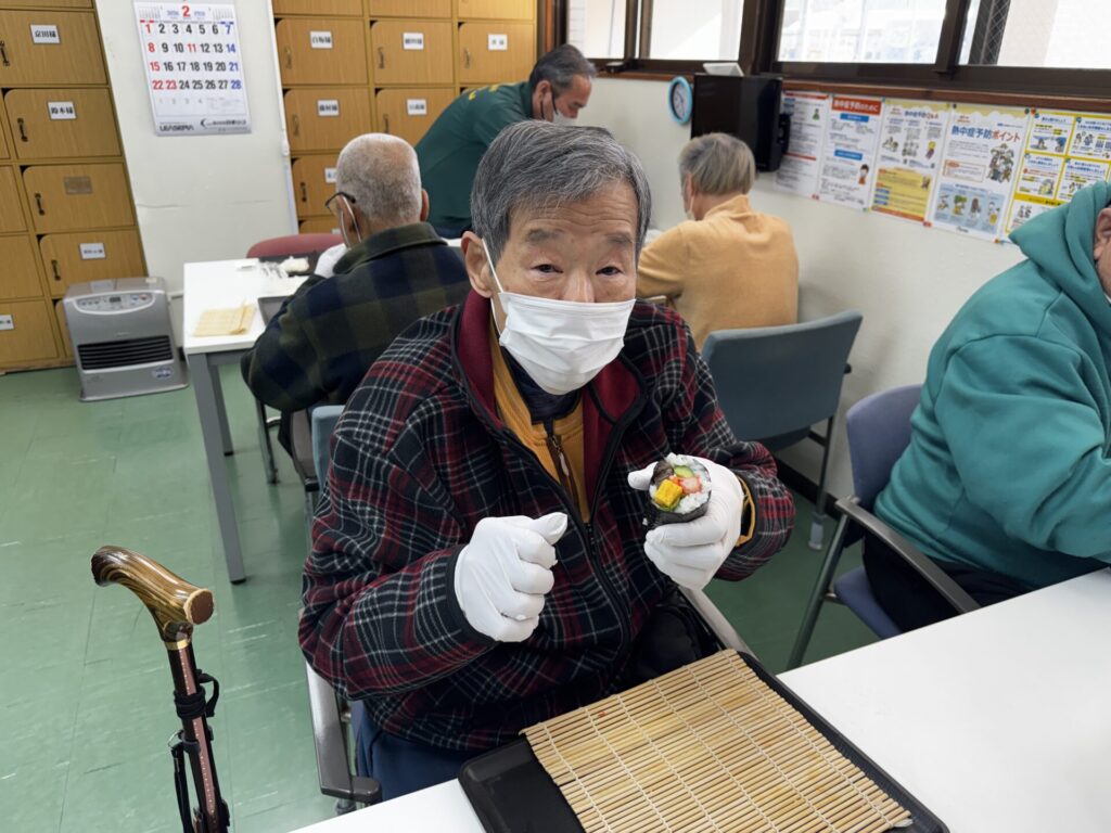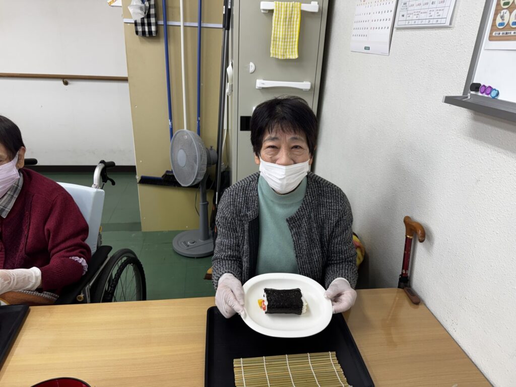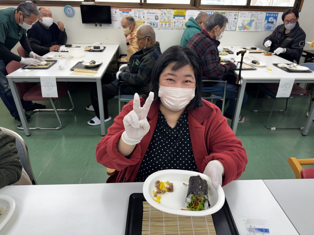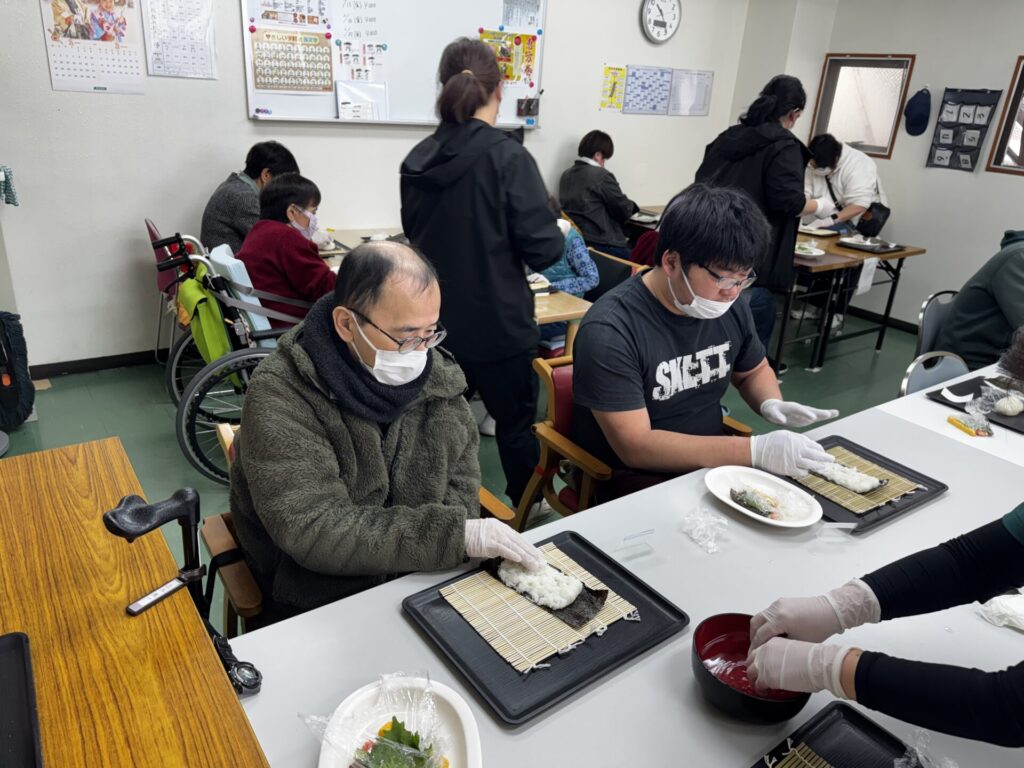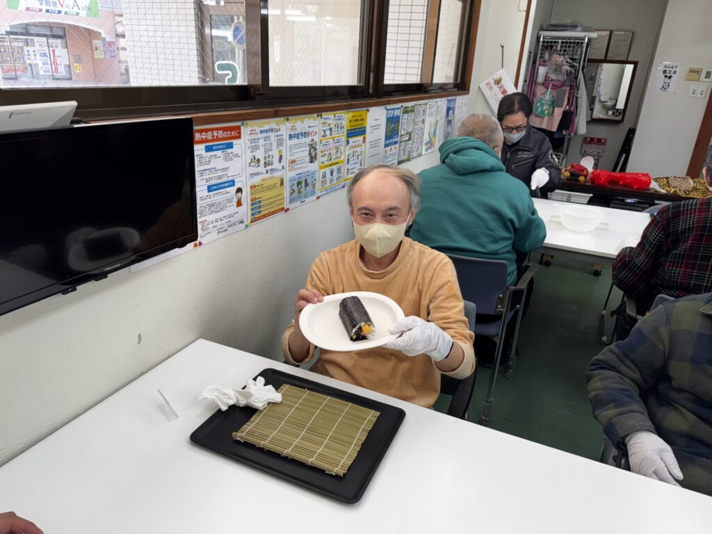 皆さんお好きな具材を選び、職員がお手伝いしながら、巻きすを使ってくるくる🎶